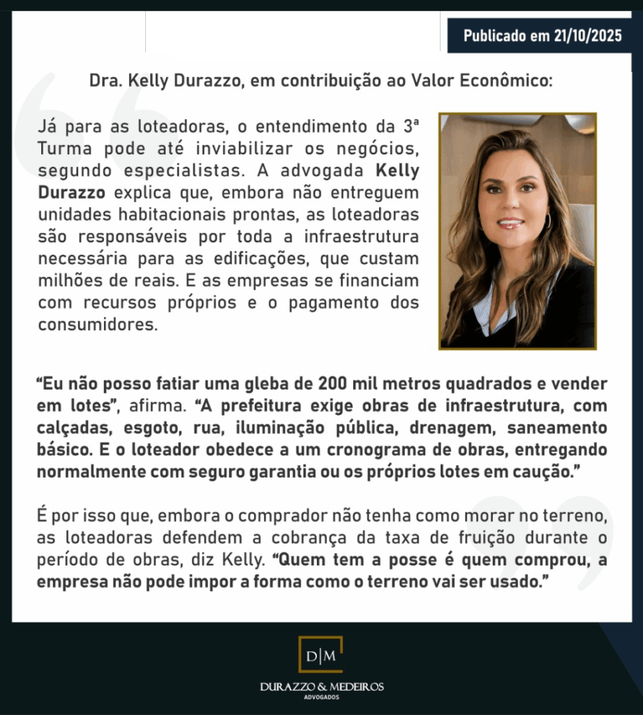 Já para as loteadoras, o entendimento da 3ª Turma pode até inviabilizar os negócios, segundo especialistas. A advogada Kelly Durazzo explica que, embora não entreguem unidades habitacionais prontas, as loteadoras são responsáveis por toda a infraestrutura necessária para as edificações, que custam milhões de reais. E as empresas se financiam com recursos próprios e o pagamento dos consumidores.